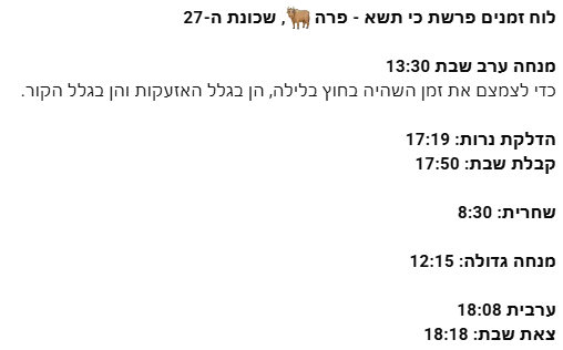 מנחה: קיץ 13:15, חורף 12:45; מוצ"ש: